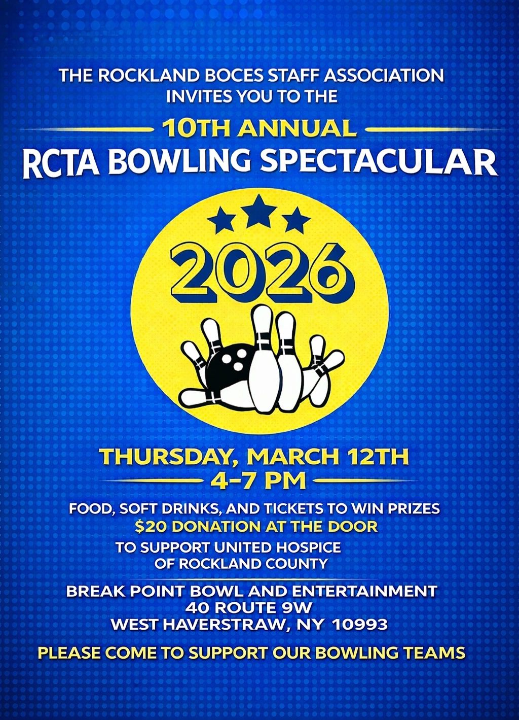 The RCTA (Rockland County Teachers Association) holds an annual "Bowling Spectacular" fundraiser, United Hospice of Rockland County.